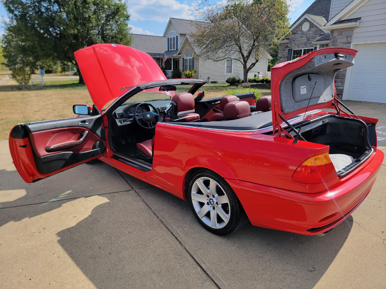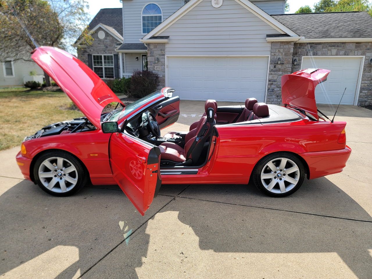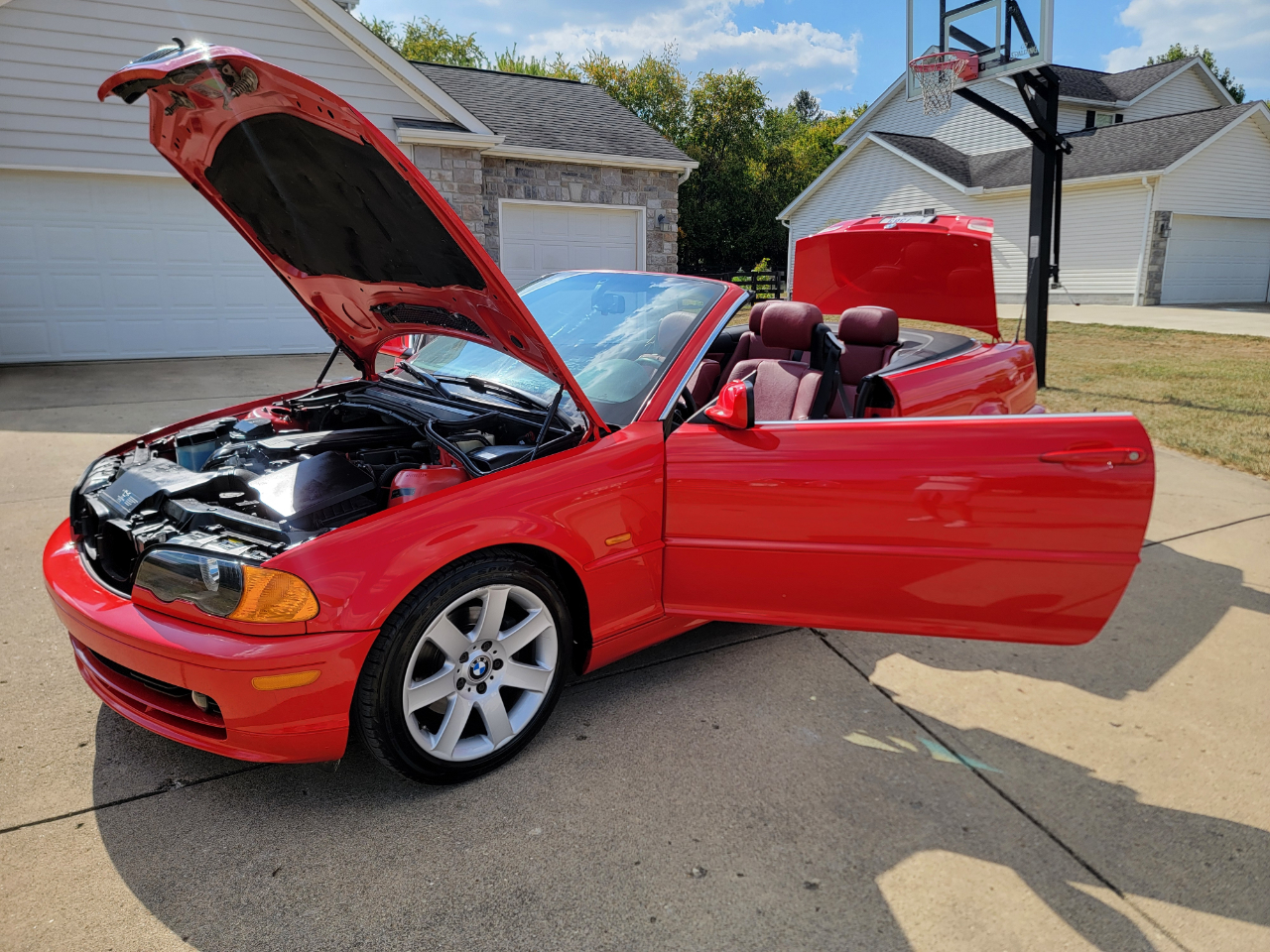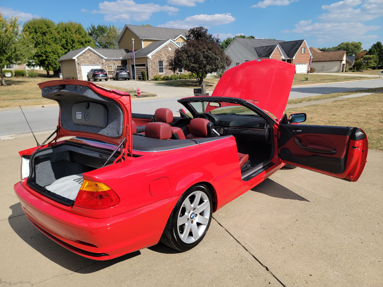Two owner 2001 BMW 325Ci with only 39K miles. Hellrot Red over Dark Red Leather. Factory Sport Package with a hard to find 5SP manual transmission. Hands free power top. First owner had it for 20 years. Hands free power top. Heated power seats. What a nice, well kept example!